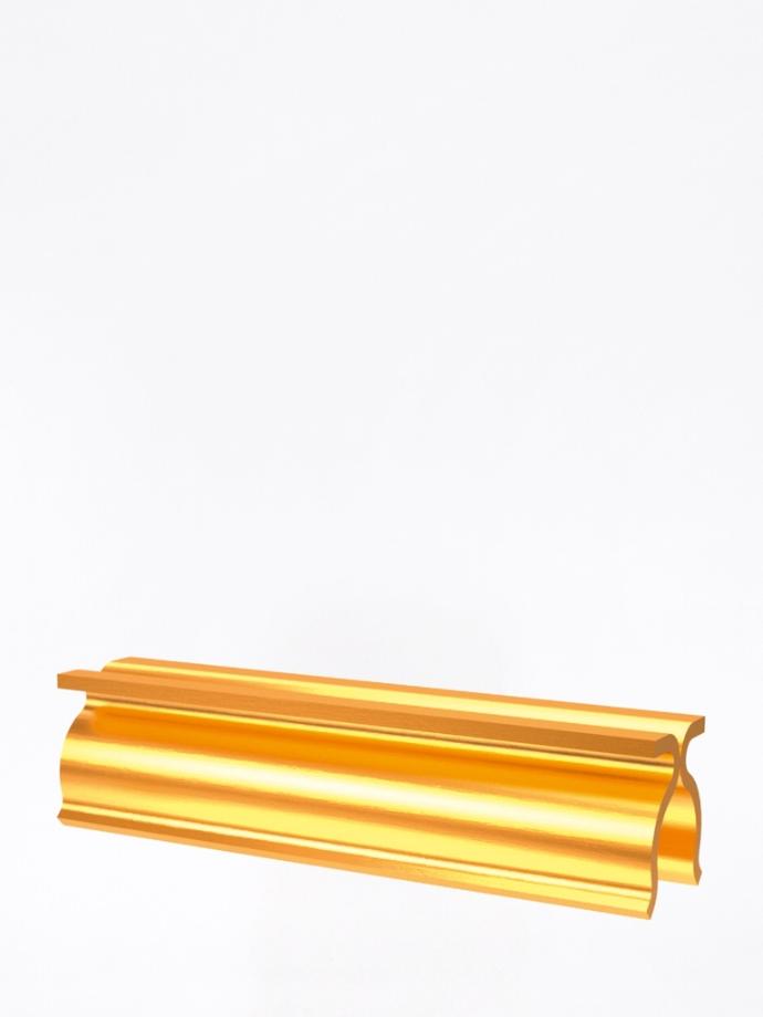 Femmina E L50 è una componente del sistema di barra ritentiva a profilo rotondo con cavaliere. Realizzata in lega nobile gialla Elitor®, ha una lunghezza di 50 mm e presenta due alette per la ritenzione nella resina. Si incorpora nella resina e può essere accorciata per adattarsi alla lunghezza della barra.
