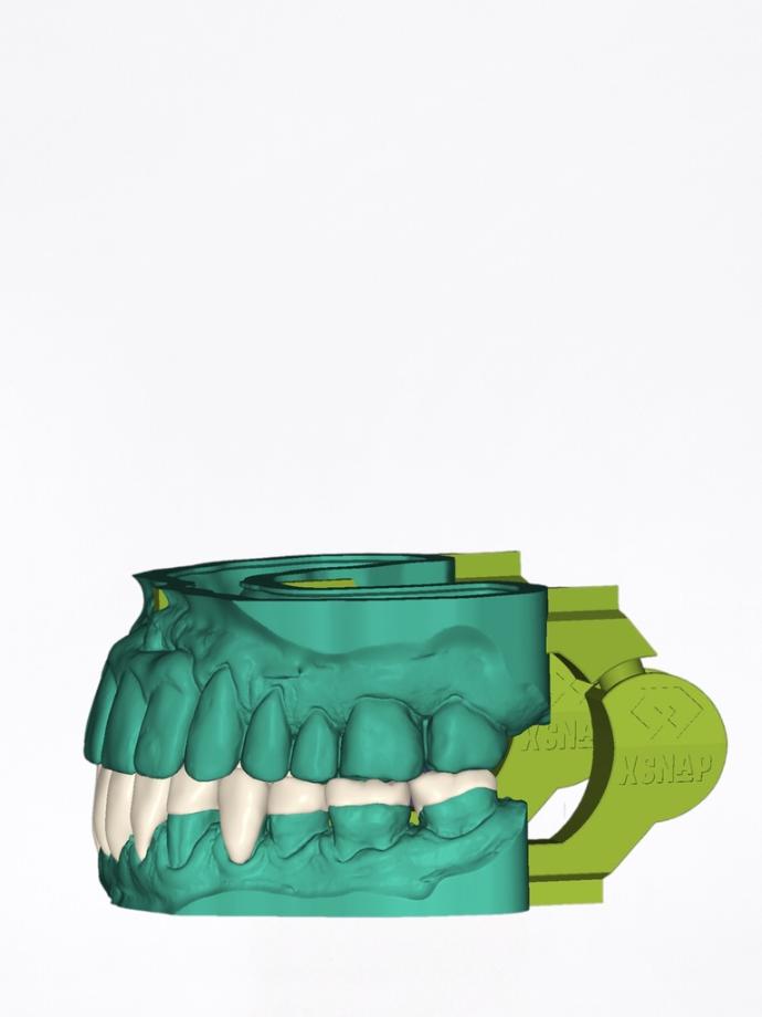 L’articolatore 3D del modulo xSNAP è dotato di una testa sferica che, a differenza degli articolatori clip-fold, consente sia il movimento di apertura e chiusura, ma anche la protrusione e la laterotrusione della mascella. Quattro tipi di inclinazioni consentono di eseguire il movimento di articolazione dei modelli anche senza regolazione manuale. Una guida regolabile dinamicamente permette di adattare il progetto ad ogni stampante, in base alle preferenze personali.