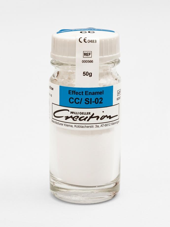 CC/ Effetto Smalto una massa ceramica in polvere che viene impiegata nella fase di stratificazione finale, sopra i vari strati di dentina per aumentare la luminosità del restauro, replicando la traslucenza e la brillantezza dello smalto naturale.