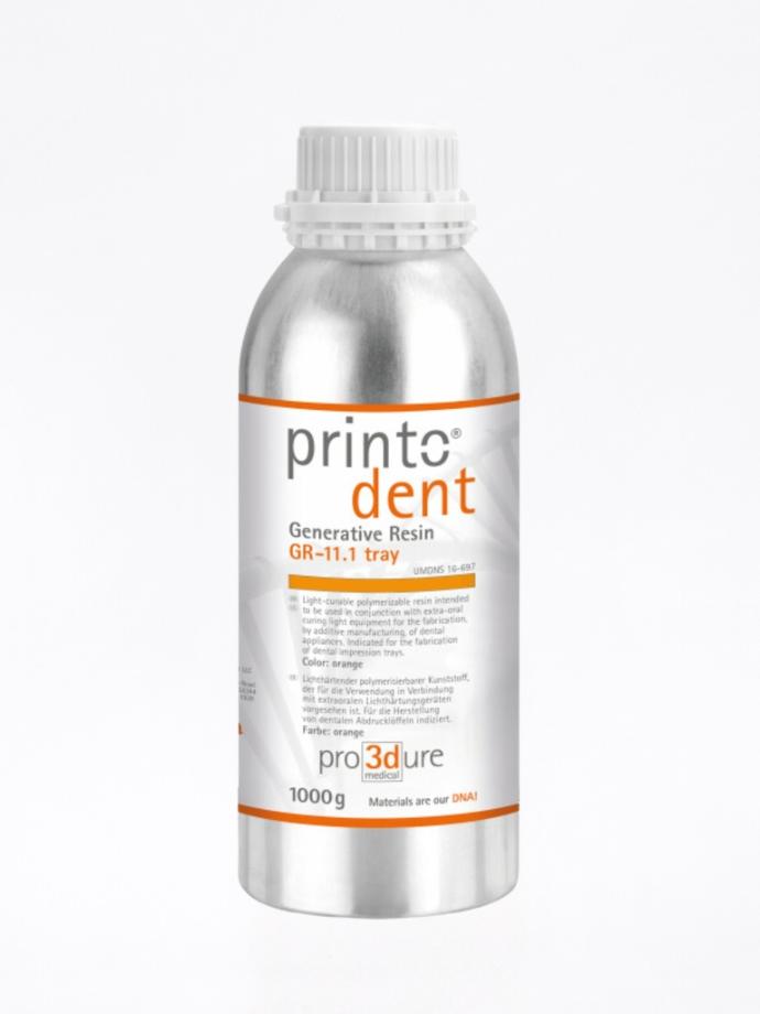 Printodent® GR-11 di Pro3dure è una resina per stampa 3D biocompatibile per la produzione di portaimpronte individuali personalizzati. Grazie alla sua solidità, è possibile ottenere modelli con un'altezza fino a 300 μm. La resina ha una capacità elastica che rende il portaimpronte stabile e, nello stesso tempo, comodo e sicuro sia per il paziente che per il dentista nel momento della presa delle impronte. Compatibile con stampanti 3D a tecnologia LCD e DLP.