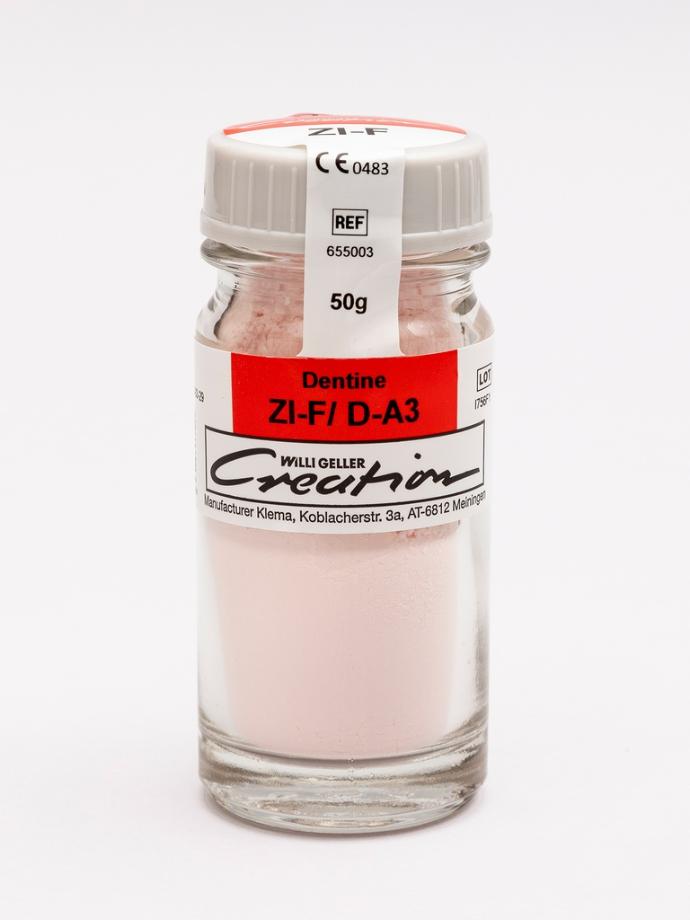 Creation ZI-F è una ceramica a basso punto di fusione ideale per eseguire rivestimenti e piccole stratificazioni su ogni tipo di armatura in Zirconia. Questa ceramica è ideale per la sua capacità di replicare riflessi luminosi naturali. Grazie al contenuto di feldspato, è molto resistente e garantisce un dinamismo luminoso naturale. La sua conformazione permette anche la correzione di veneer realizzati con la ZI-CT, poiché la temperatura di cottura della ZI-F è inferiore di ben 100° C.