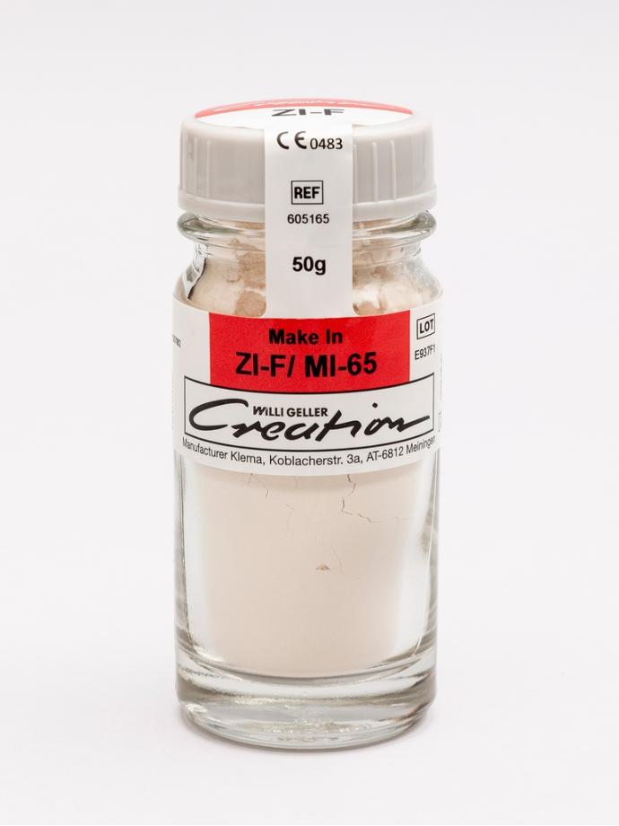 Creation ZI-F è una ceramica a basso punto di fusione ideale per eseguire rivestimenti e piccole stratificazioni su ogni tipo di armatura in Zirconia. Questa ceramica è ideale per la sua capacità di replicare riflessi luminosi naturali. Grazie al contenuto di feldspato, è molto resistente e garantisce un dinamismo luminoso naturale. La sua conformazione permette anche la correzione di veneer realizzati con la ZI-CT, poiché la temperatura di cottura della ZI-F è inferiore di ben 100° C.